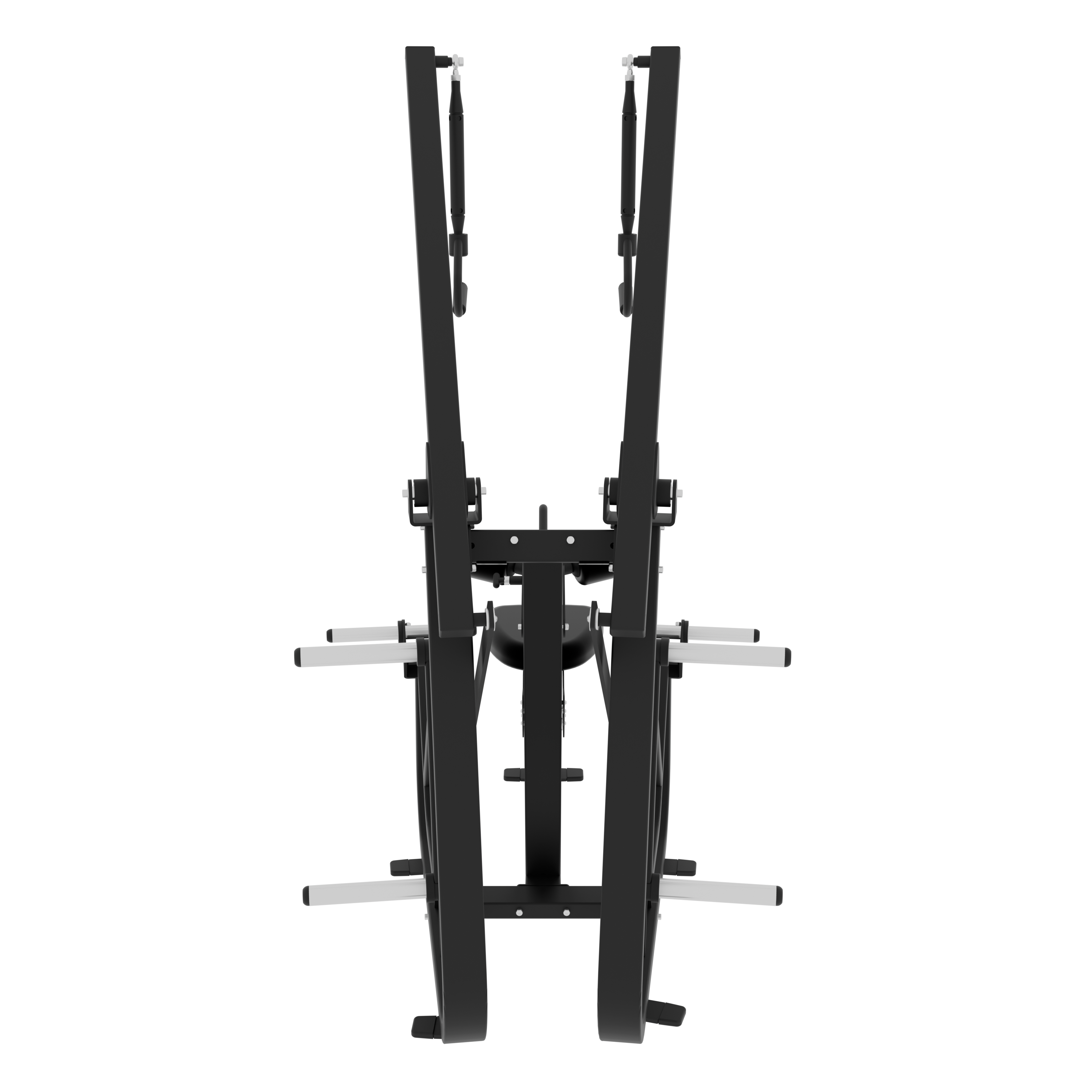 Plate-loaded design using standard Olympic plates with two storage horns and up to 120 kg / 265 lb of loading capacity per side on movement arms