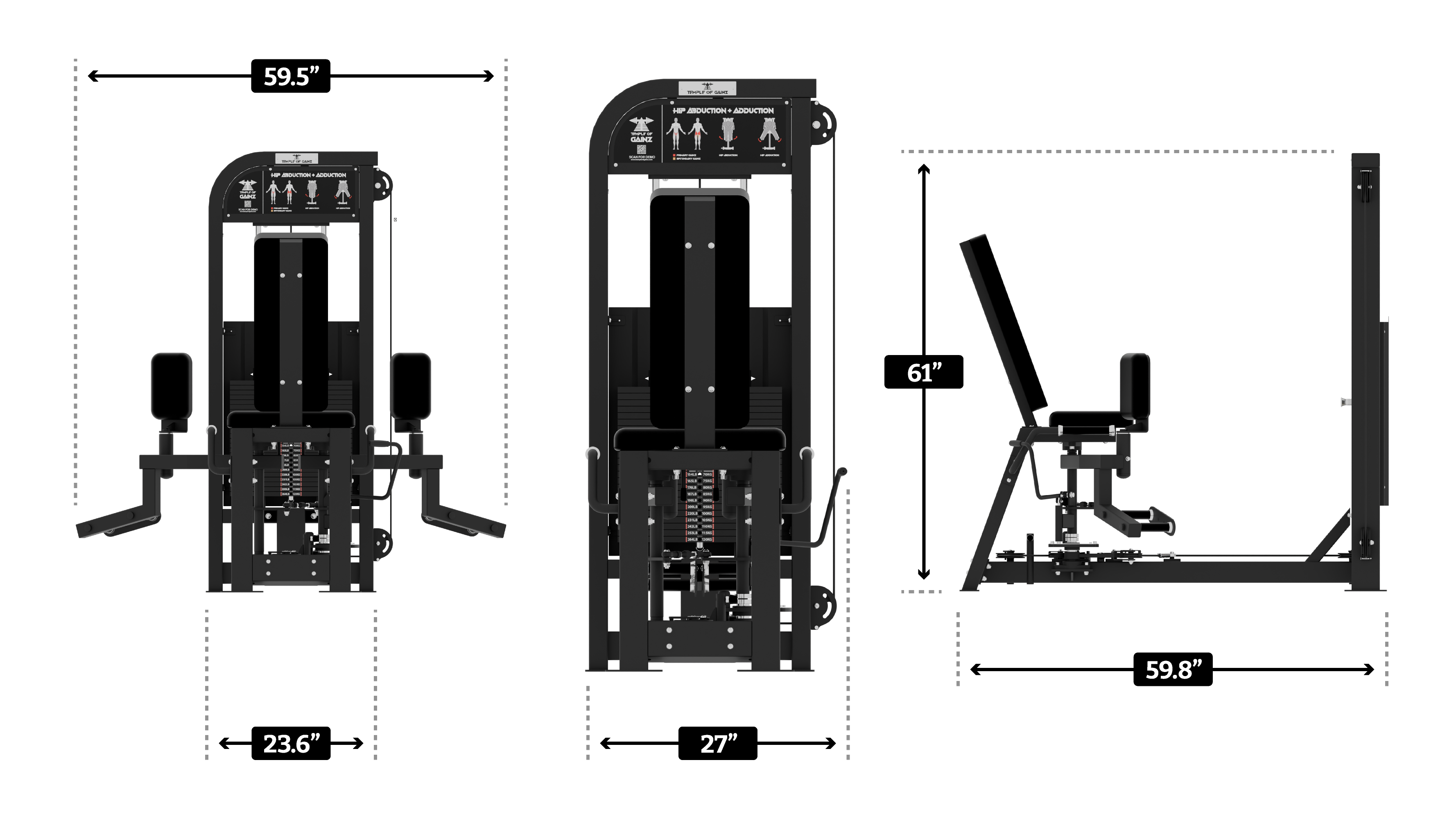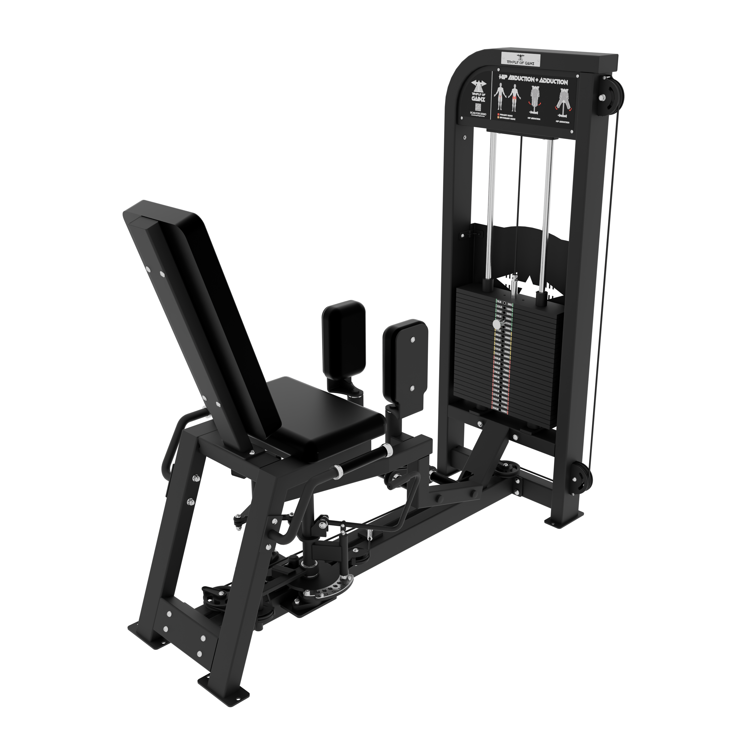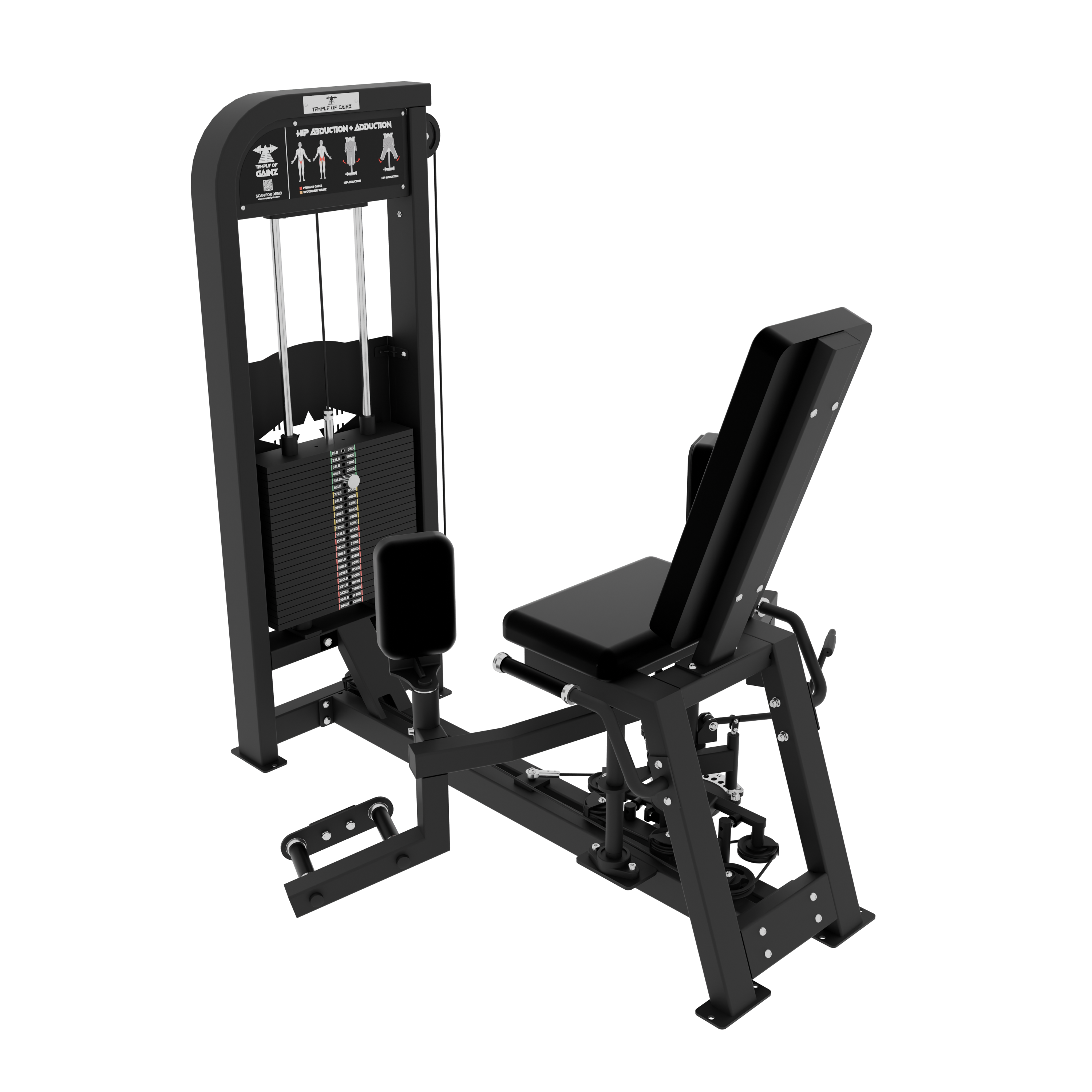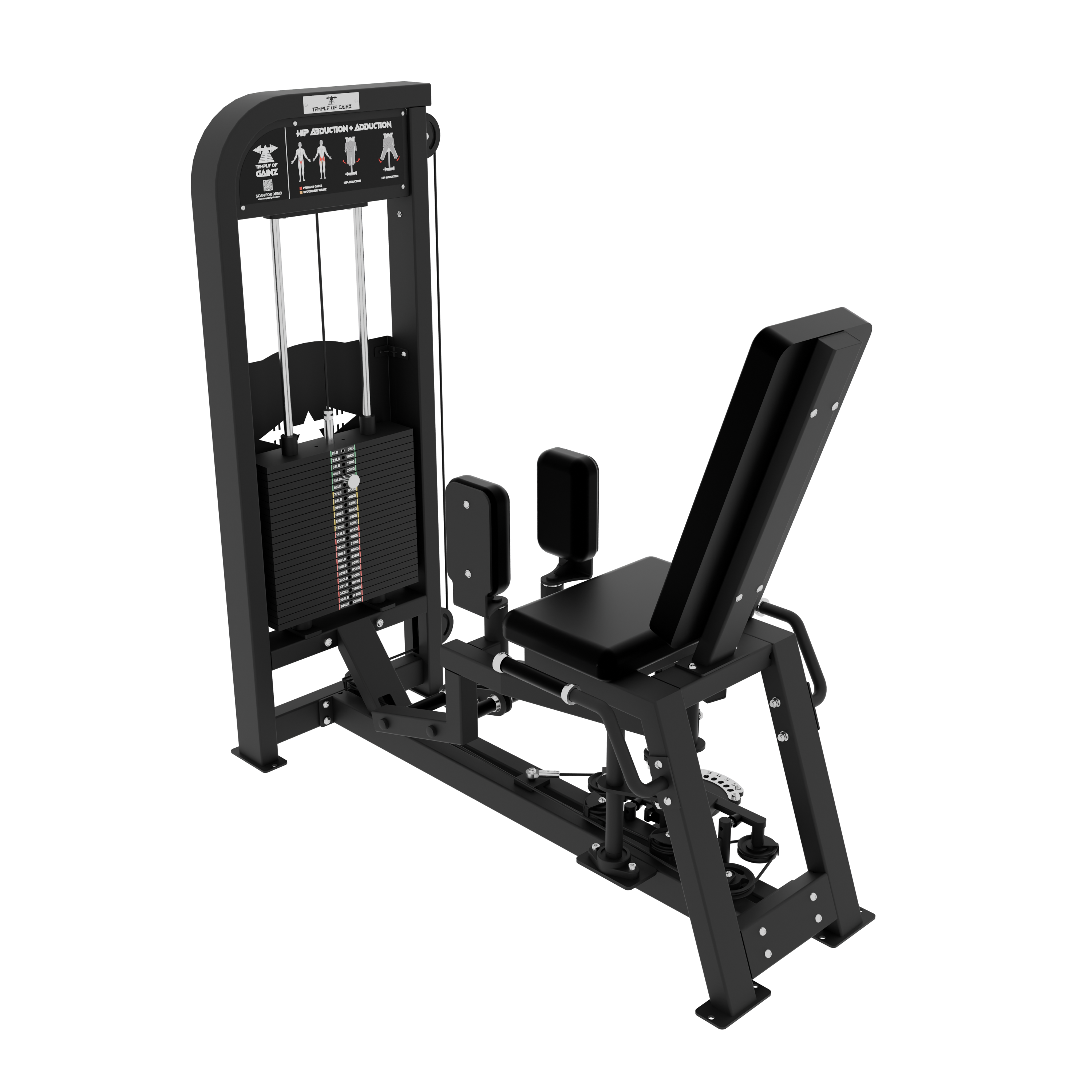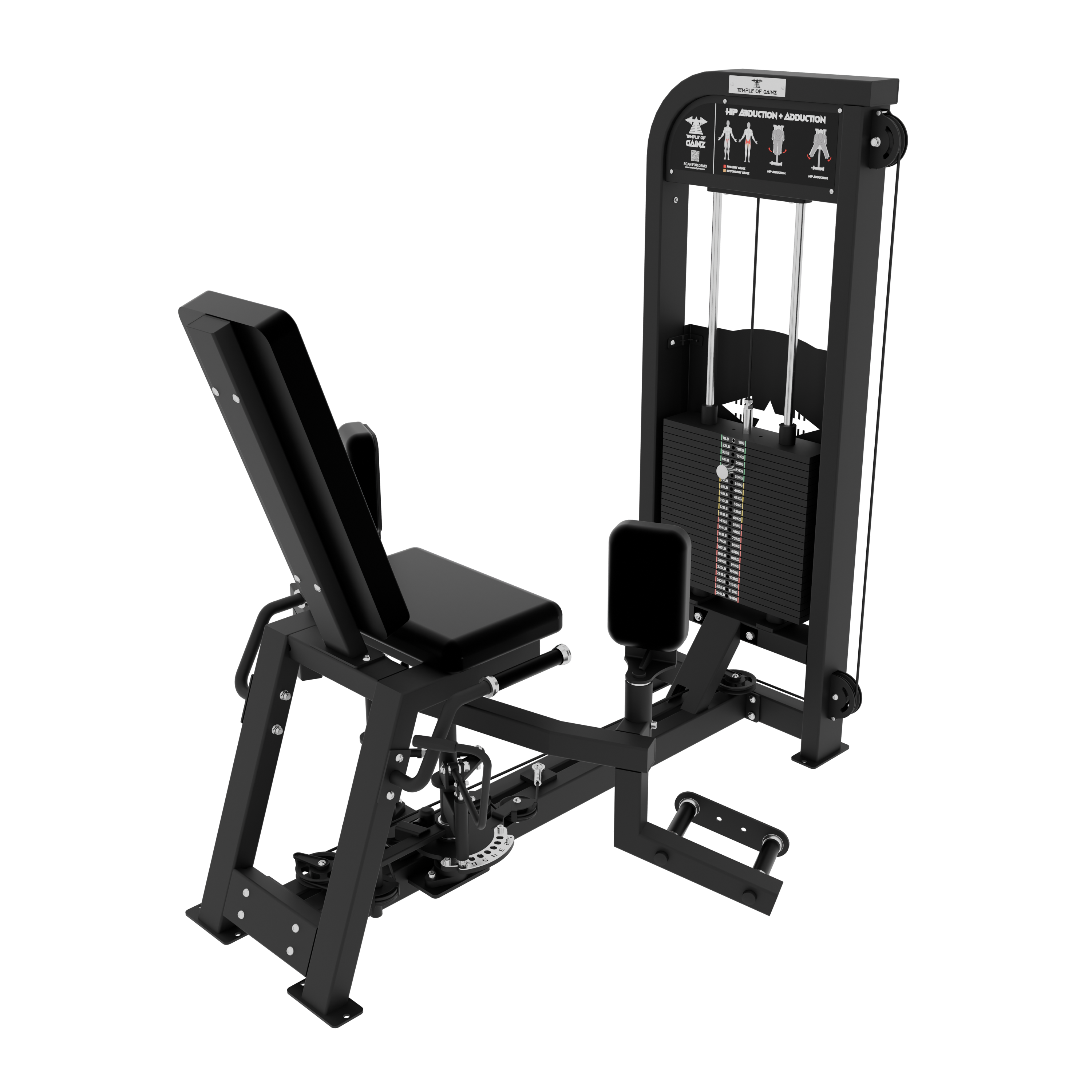 The Temple of Gainz Selectorized Hip Abduction + Adduction Machine is a compact dual-function unit designed to train the inner and outer thighs with smooth, consistent resistance. This versatile design targets the frequently overlooked hip abductors and adductors, which play a key role in hip stability, athletic performance, and balanced lower body development.